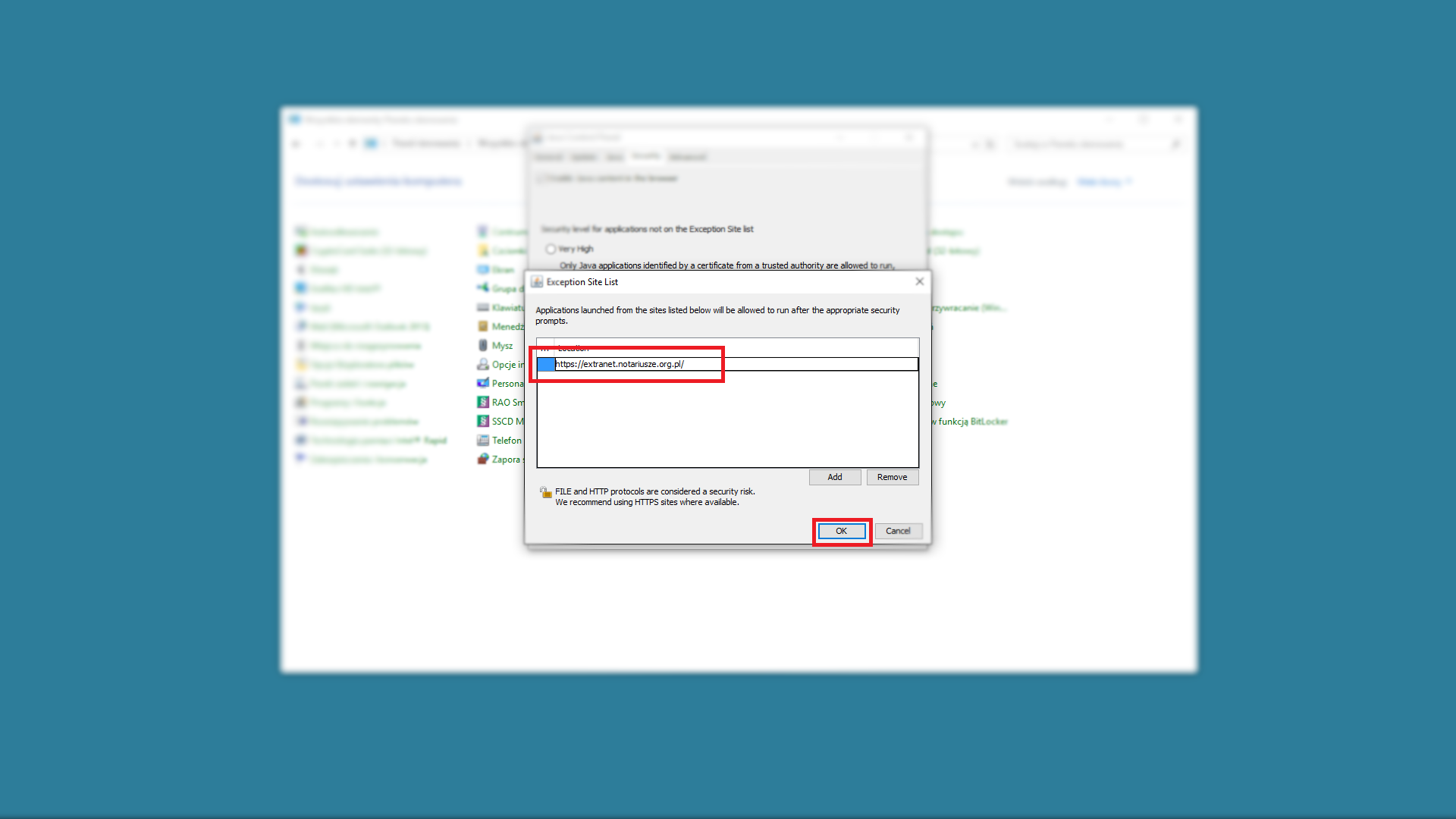 W takim przypadku należy dodać pełny adres extranetu do listy wyjątków JAVA. Pełny adres to https://extranet.notariusze.org.pl/ Należy pamiętać o ukośniku na końcu oraz przedrostku HTTPS.
