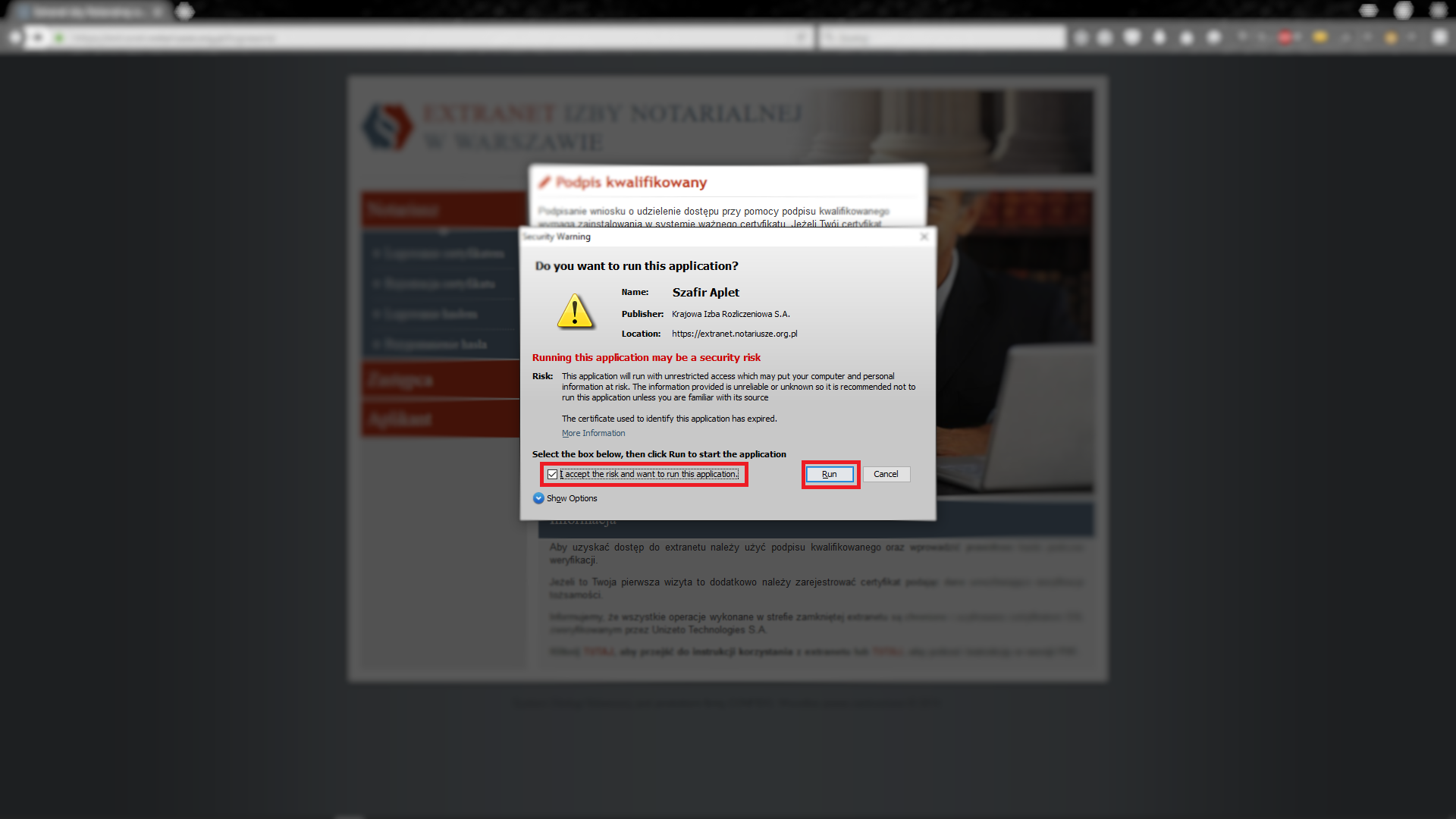 Domyślnie przeglądarki blokują możliwość wykorzystania apletu JAVA. W obrębie domeny https://extranet.notariusze.org.pl należy zezwalać na wszystkie komunikaty wyświetlane na ekranie. Docelowo w okolicach adresu URL nie powinno być żadnej ikonki ostrzegawczej (kolor czerwony)
