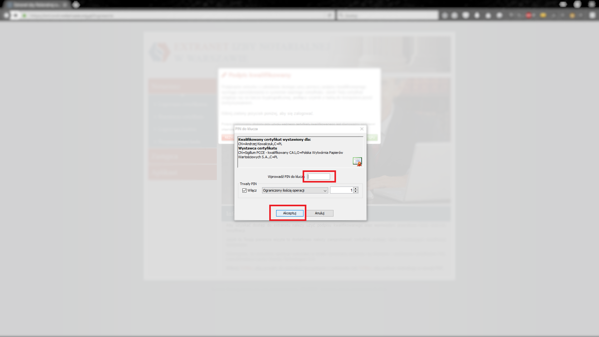 Aby uzyskać dostęp do extranetu należy użyć podpisu kwalifikowanego oraz wprowadzić prawidłowy PIN podczas weryfikacji. Jeżeli to Twoja pierwsza wizyta to dodatkowo należy zarejestrować certyfikat podając dane umożliwiające weryfikacje tożsamości.