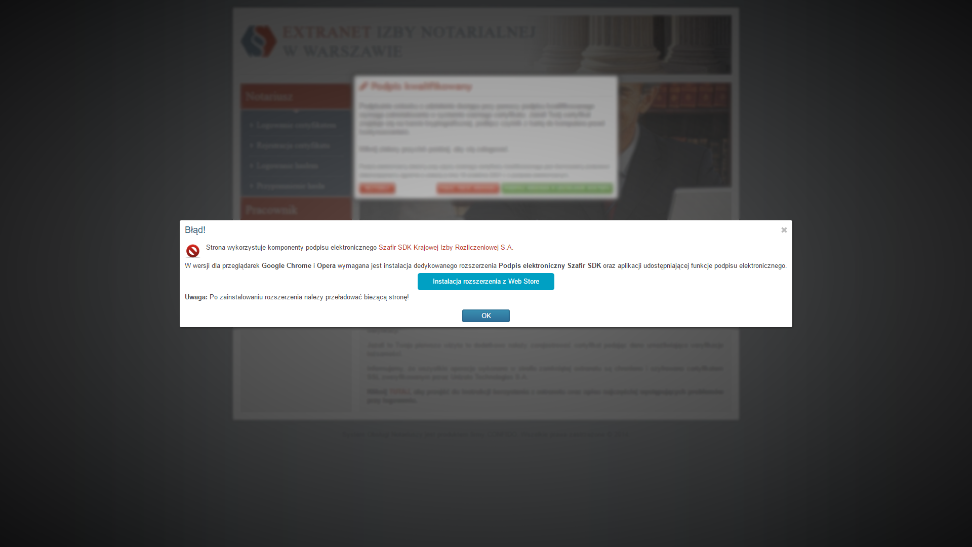 W przypadku komunikatu o braku zainstalowanego rozszerzenia Szafir SDK, należy je zainstalować klikając na przycisk "Instalacja rozszerzenia z Web Store":